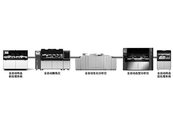 石家庄钱飞健康产品研究有限公司将自主研发的全自动样本全处理系统、全自动酶免仪、全自动血型分析仪、全自动样本回收系统与日立7600生化分析仪进行整合,设计为一套完整成熟的适合血站的全实验室自动化流水线系统的解决方案,满足临床全自动化的检测需求。